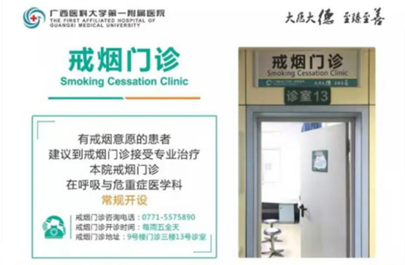 广西医科大学第一附属医院开设戒烟门诊,对吸烟者进行评估,包括吸烟情况、成瘾情况和戒烟意愿等,针对个体情况制定个性化戒烟治疗方案,包括处方戒烟药物、进行行为干预、提供戒烟咨询等。只接收图文形式。